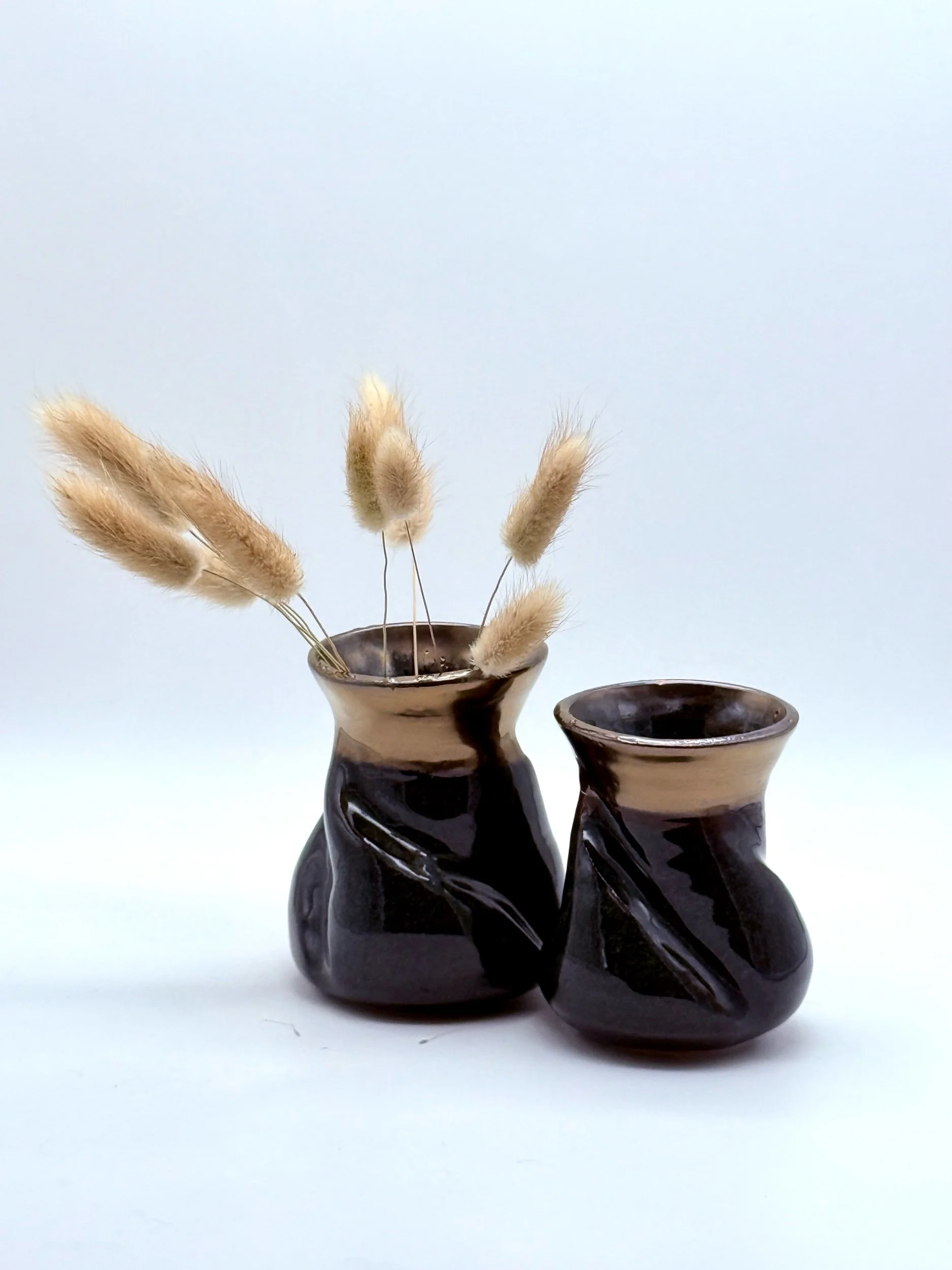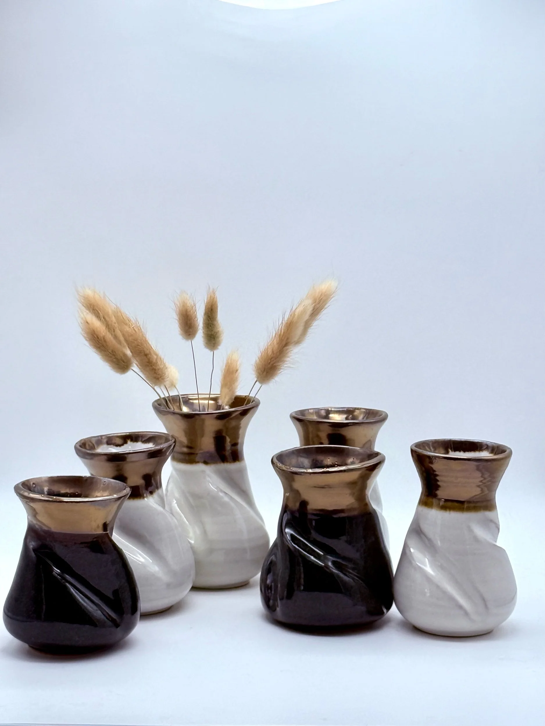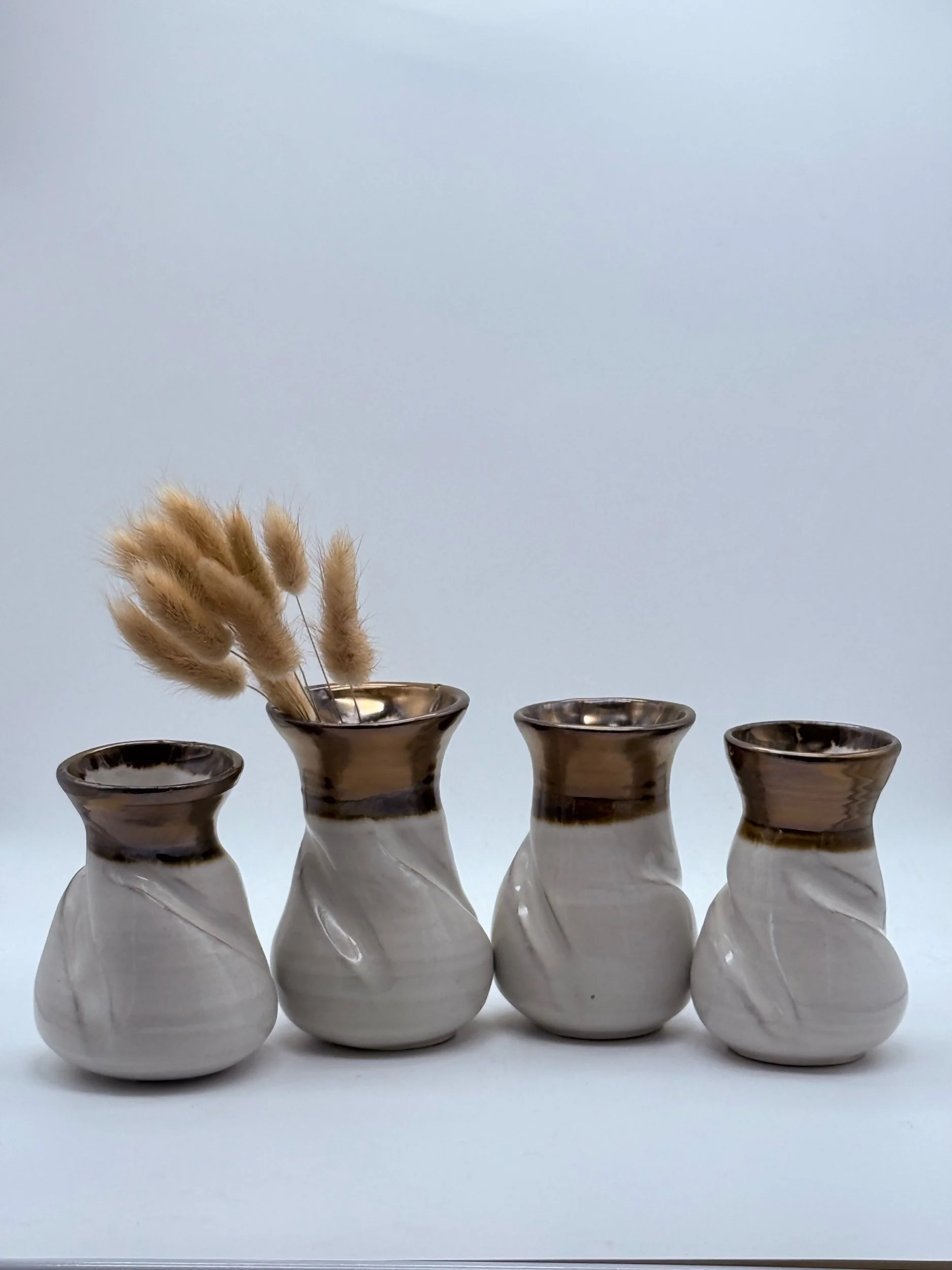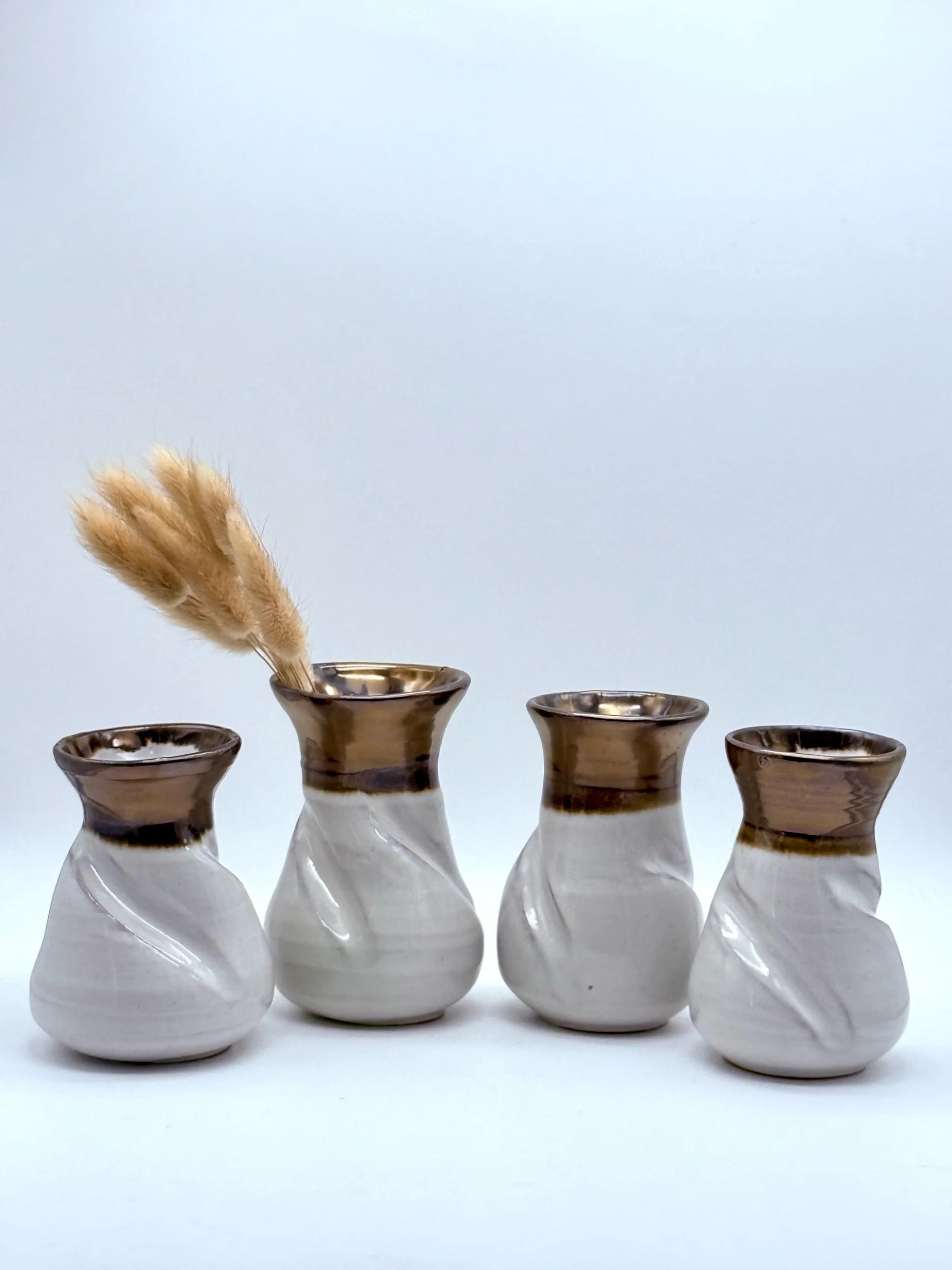 These beautiful bud vases in classic white and gold glazes are perfect for flowers from the garden or a small bouquet. They would cheer up any corner of the house, windowsill, side table, or even a bookshelf.