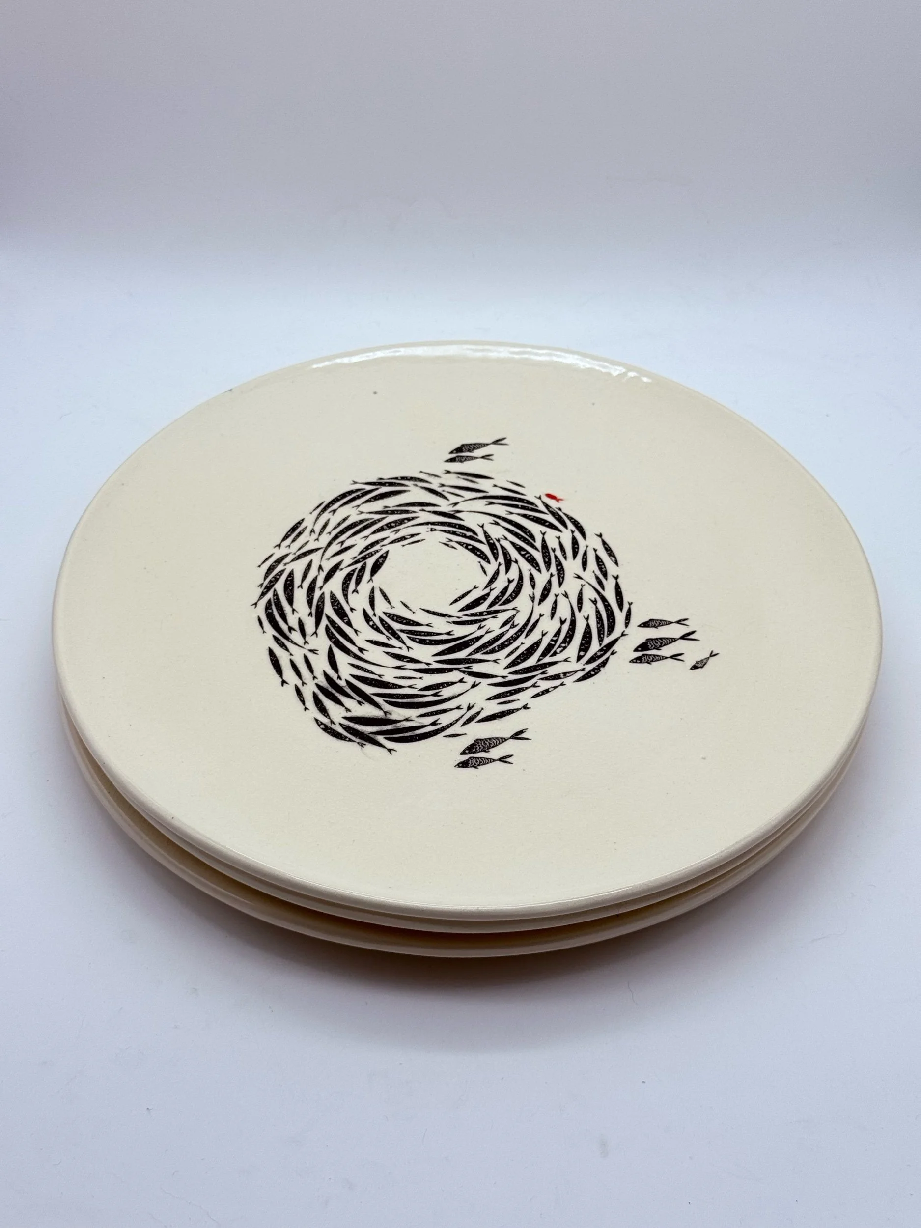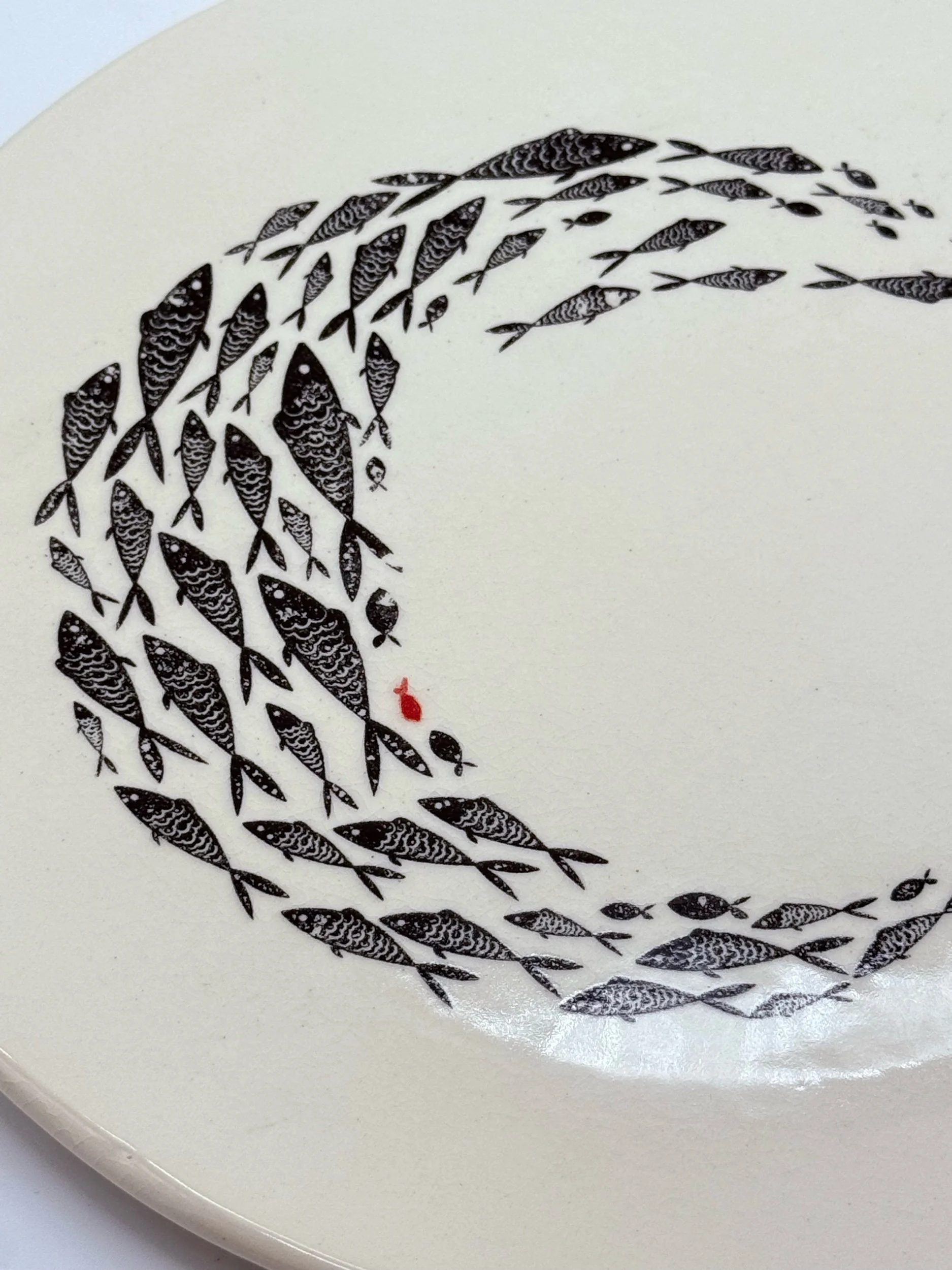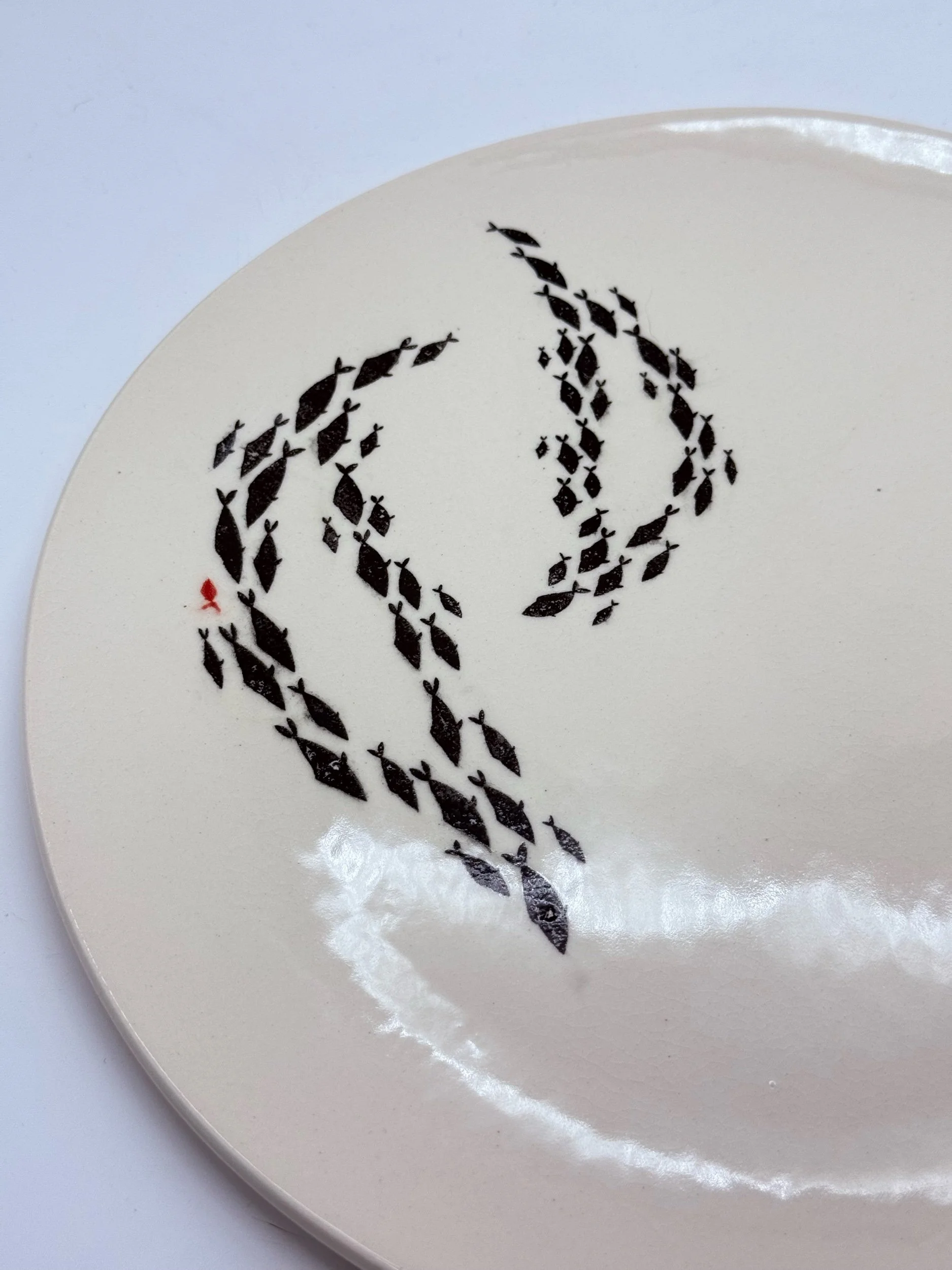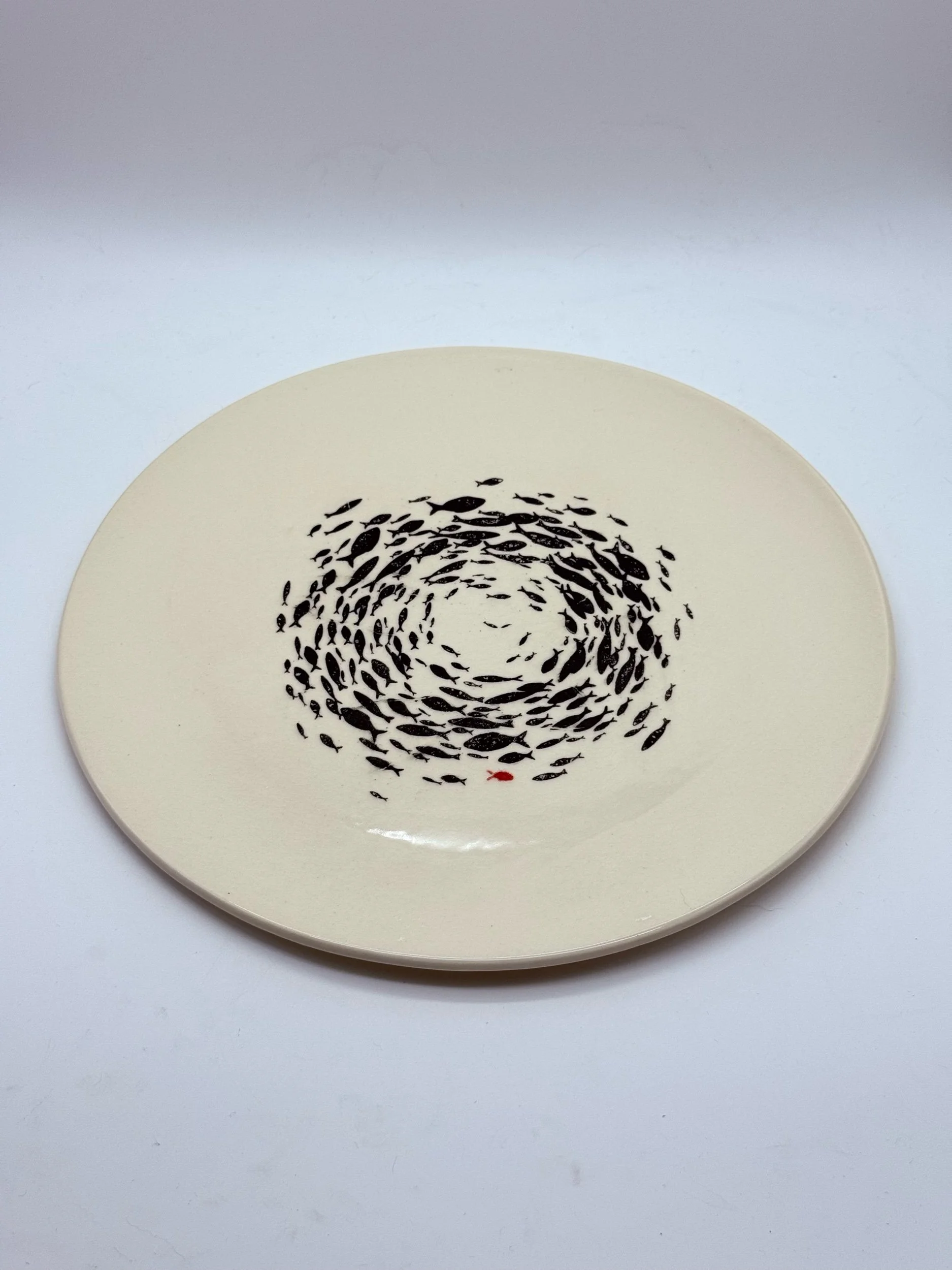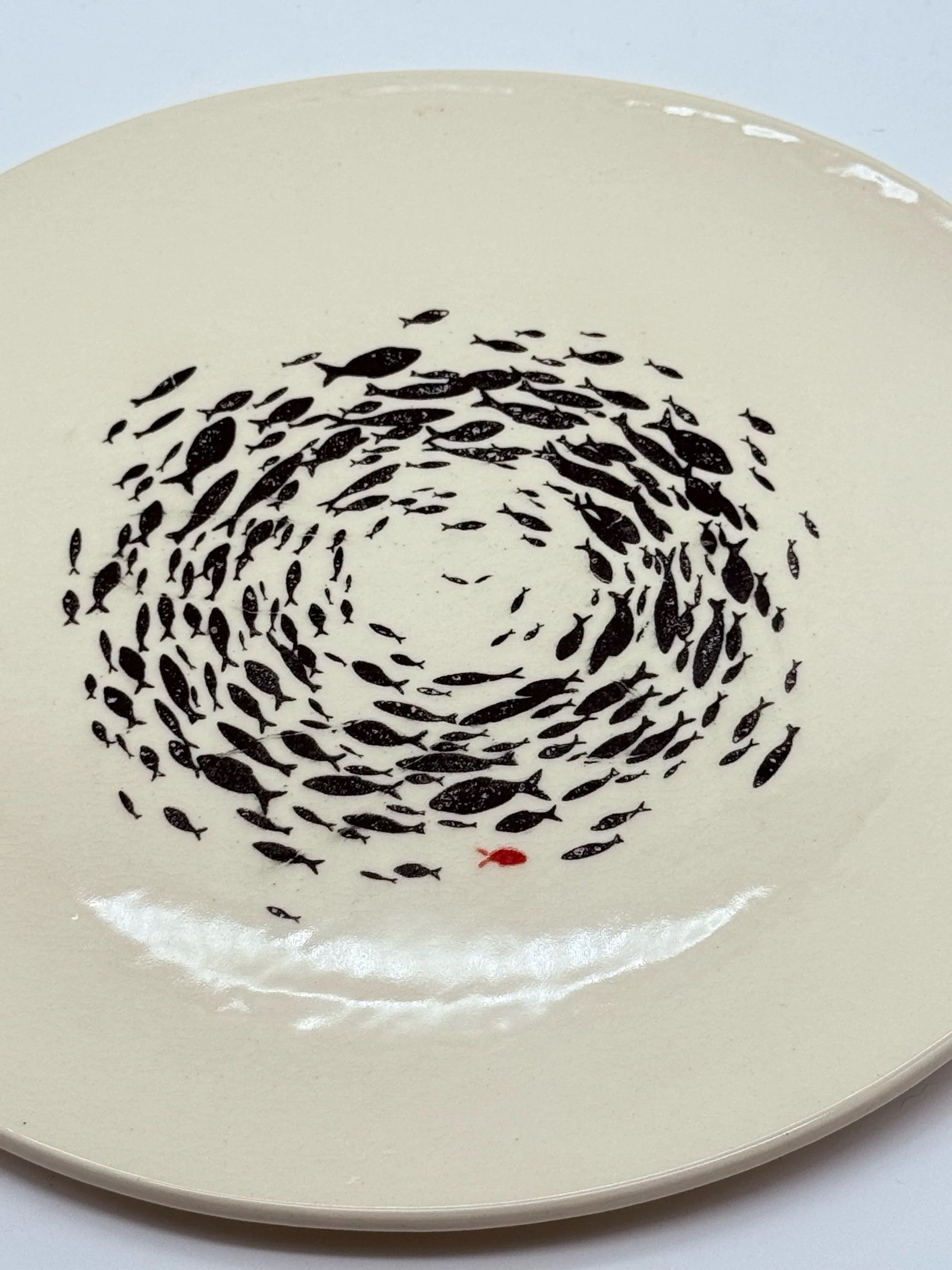 Bring a touch of whimsy to your table with these handcrafted salad plates, featuring a lively fish design. Look closely and you’ll spot a hand-painted red fish swimming against the current—a playful symbol of individuality and going against the norm. Each plate is carefully crafted and decorated, blending function with charm. The fish design adds a whimsical, aquatic flair—perfect for serving fresh greens or main meals. Durable yet elegant, these plates are ideal for everyday use or for creating a distinctive coastal-inspired table setting.
