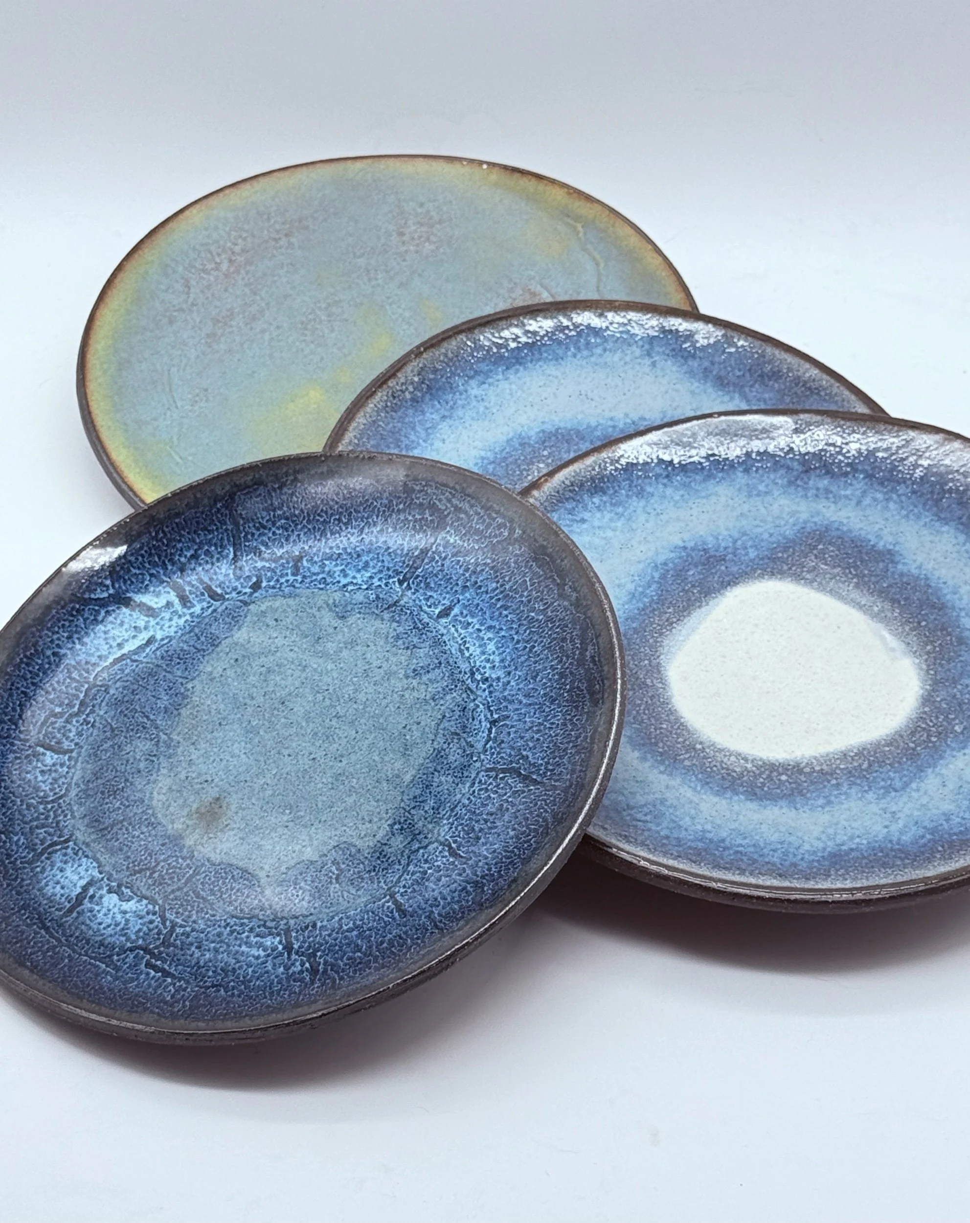 Add a touch of color to your table with these handcrafted plates, featuring two glazes - white and blue - that interact to produce unique colors. Each plate is carefully crafted and decorated, blending function with charm. The design adds flair to the table—perfect for serving snacks, appetizers, or as a candle holder. Durable yet elegant, these plates are ideal for everyday use or for creating a distinctive coastal-inspired table setting.